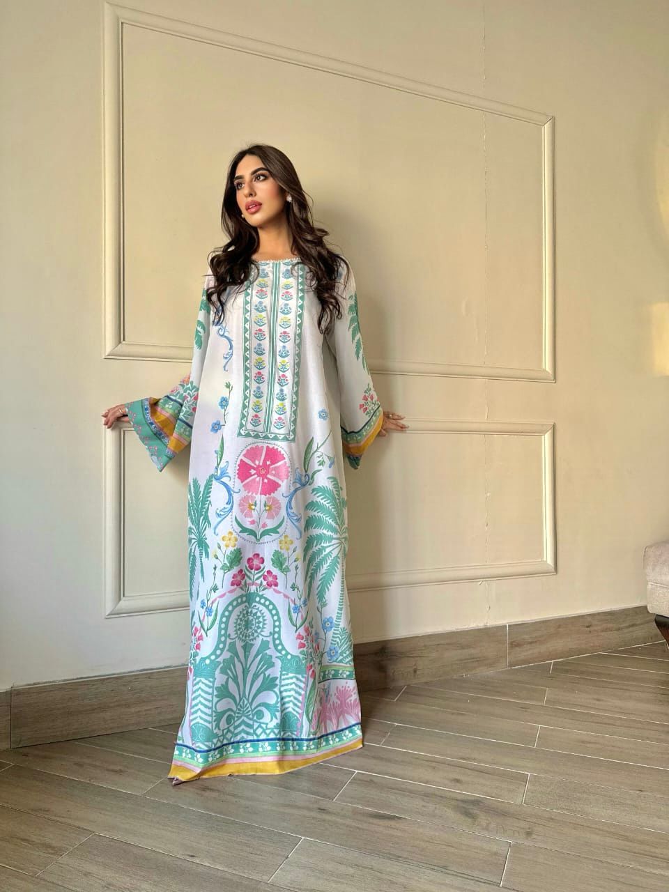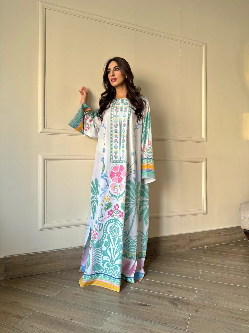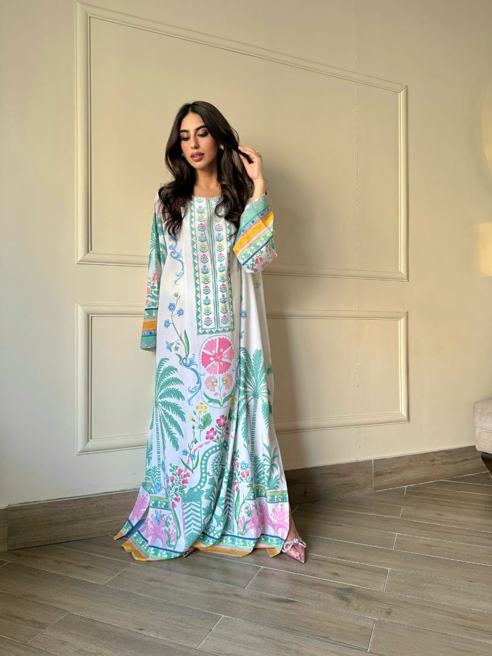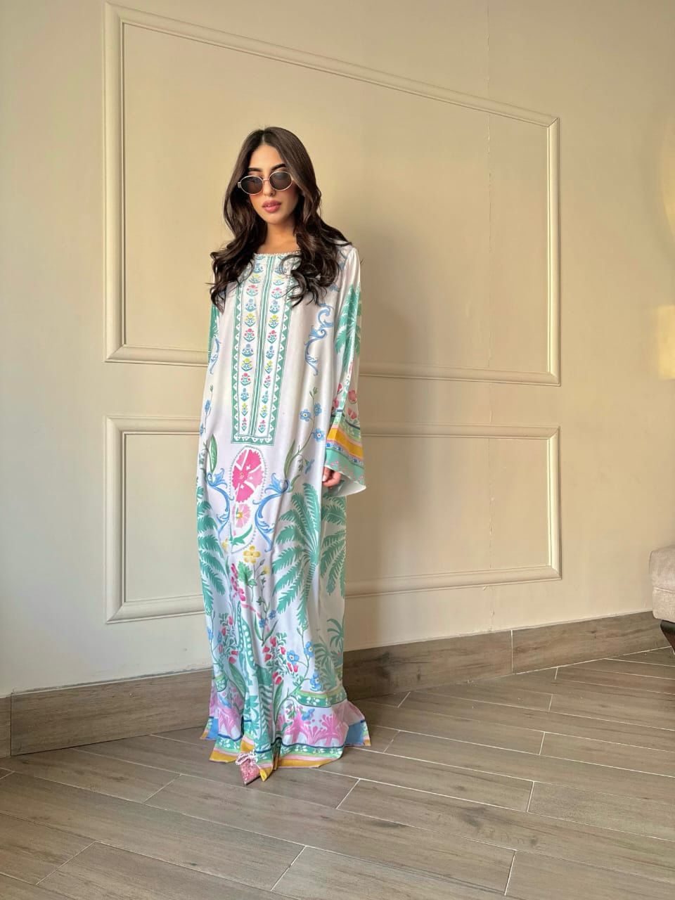 Turn your everyday look into an effortless statement with this Korean BSY full-length kaftan. Designed in refreshing mint tones with multicolour botanical prints, it blends elegance with breezy comfort. The 52-inch silhouette flows beautifully, making it perfect for brunches, vacations, or festive get-togethers.