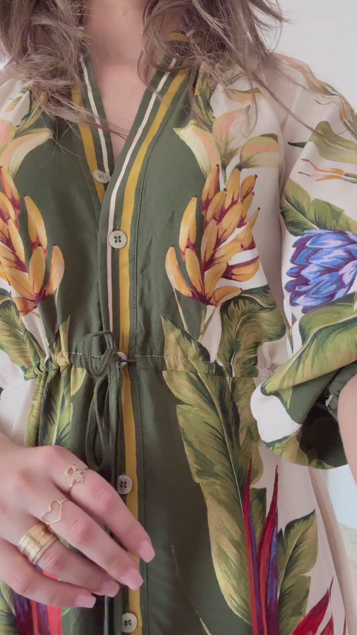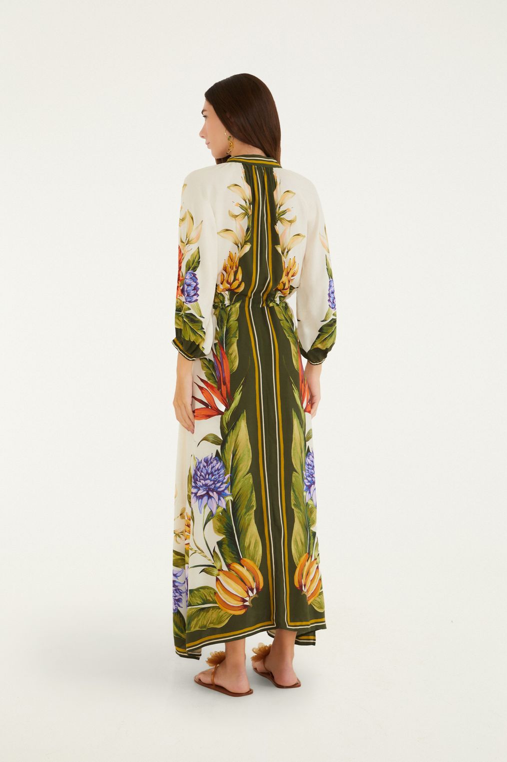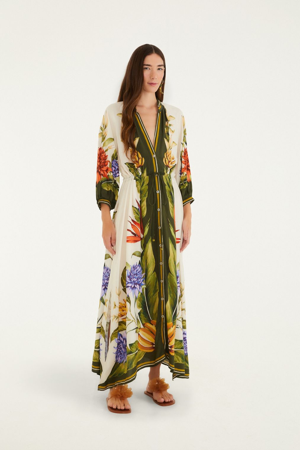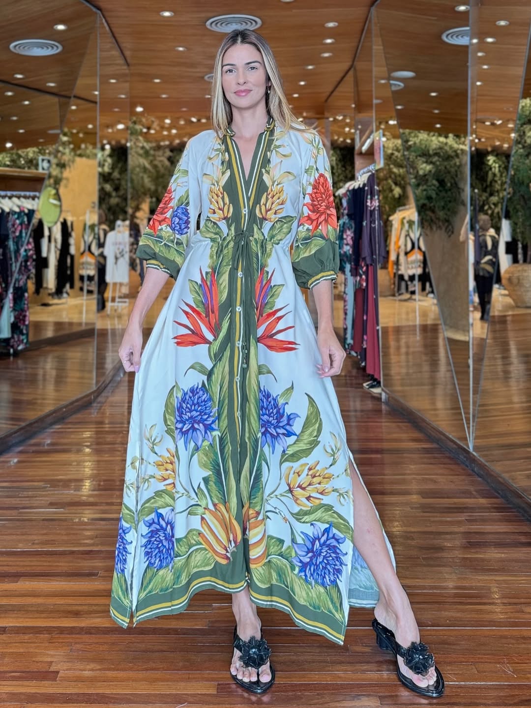 Crafted in premium Korean BSY fabric, this flowy full-length dress features a vibrant botanical print inspired by tropical gardens — showcasing bold hues of green, red, orange, and blue against a soft ivory base.