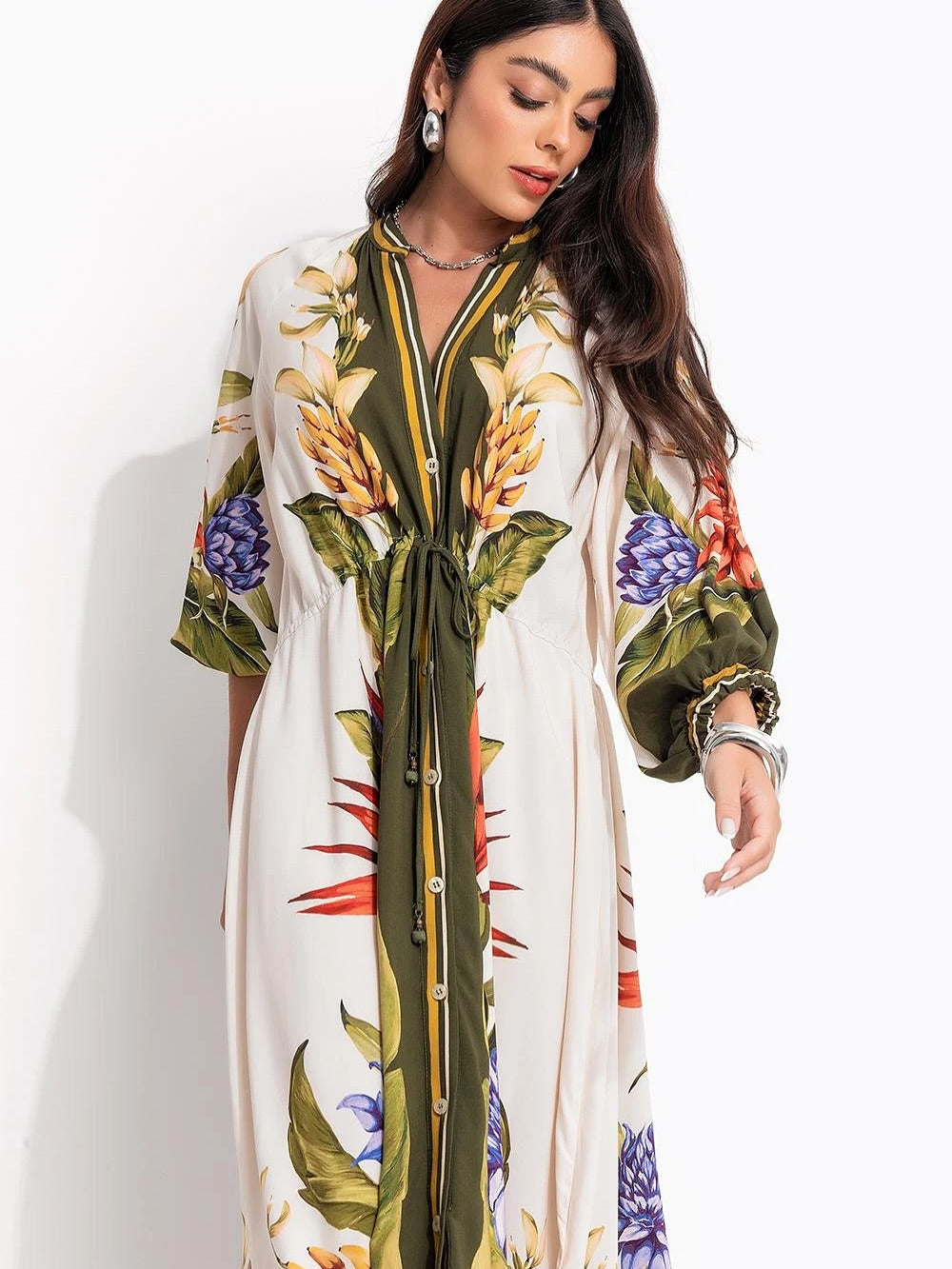 The button-down front and drawstring waist offer a flattering silhouette, while the 52-inch length adds a graceful fall, making it a versatile choice for brunches, vacations, or evening soirées.