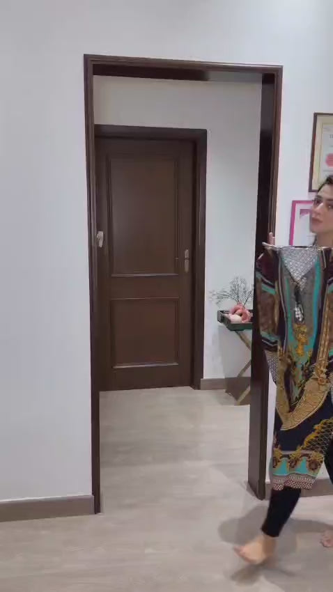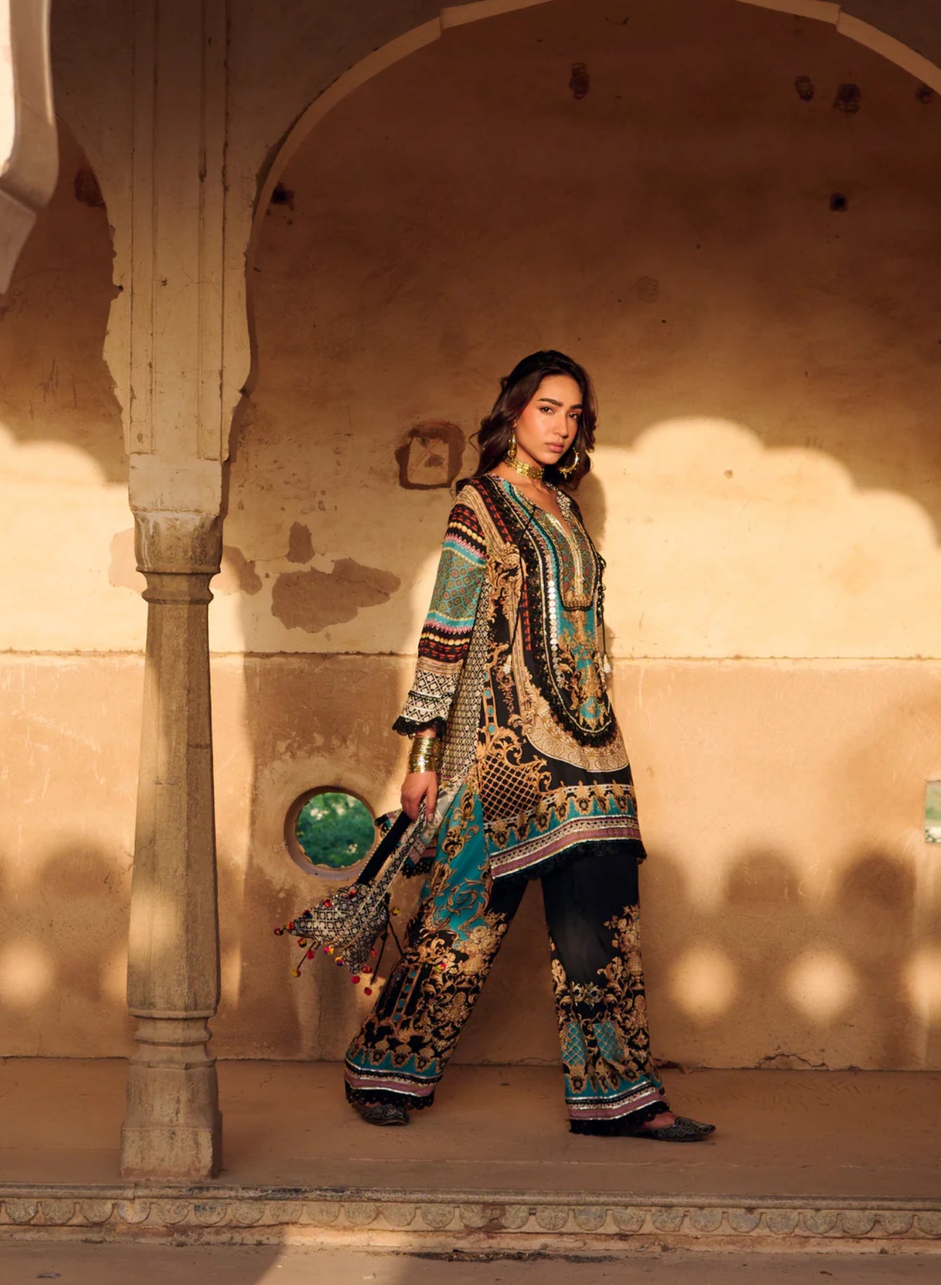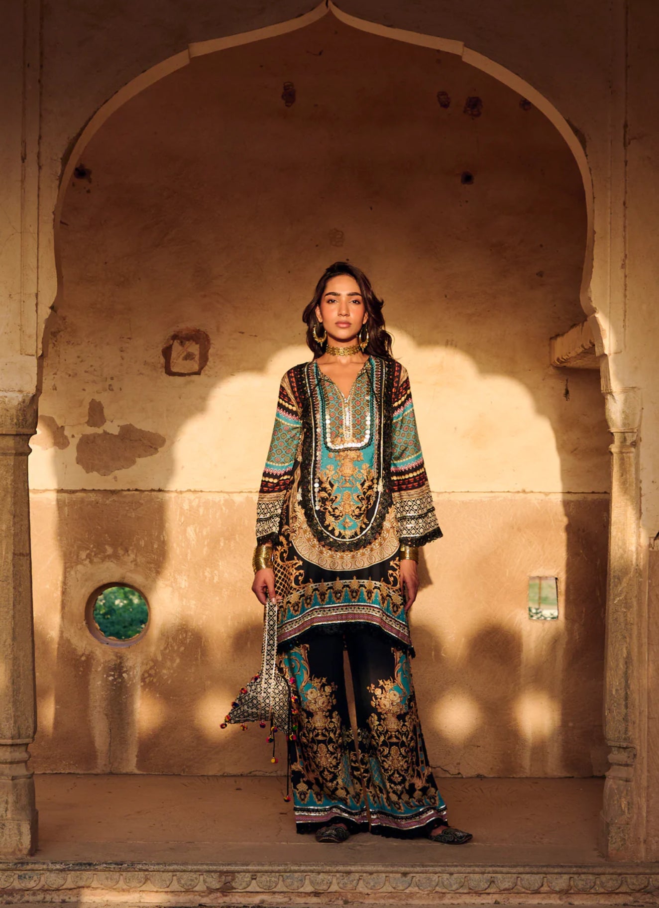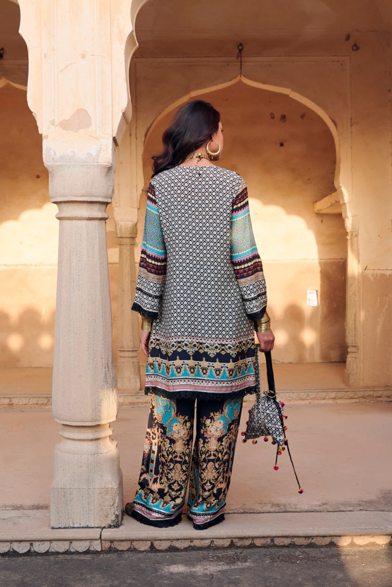 crafted in premium French Crepe for a smooth, fluid drape and polished finish. Designed for women who love bold prints with a touch of royalty, this ensemble blends classic baroque-inspired motifs with modern tailoring.