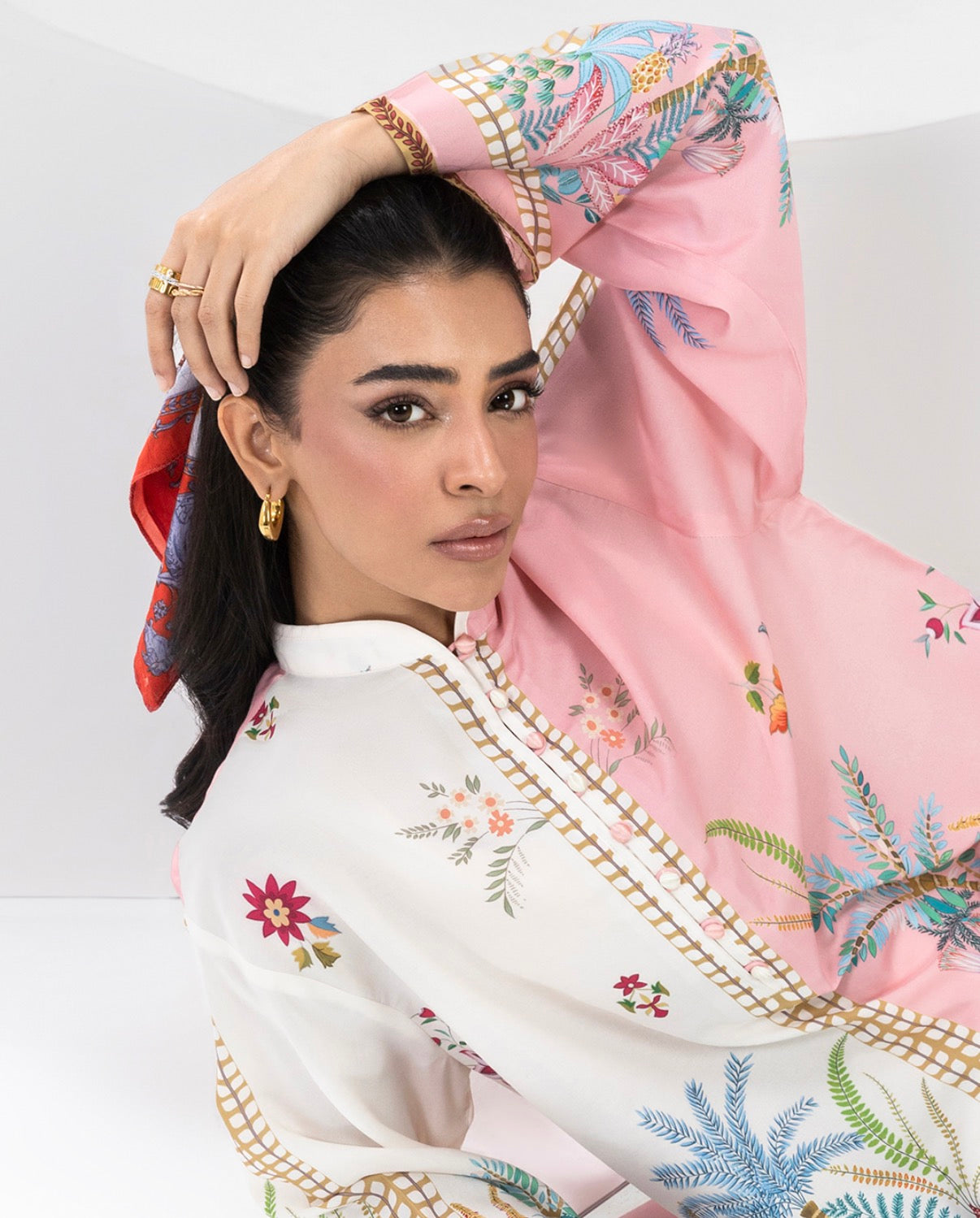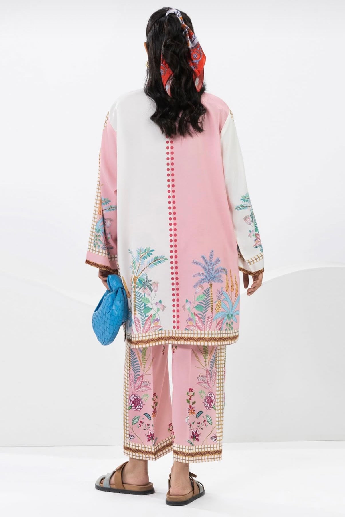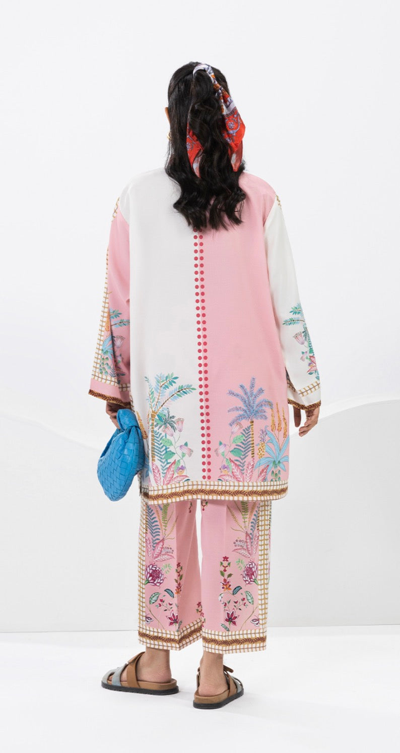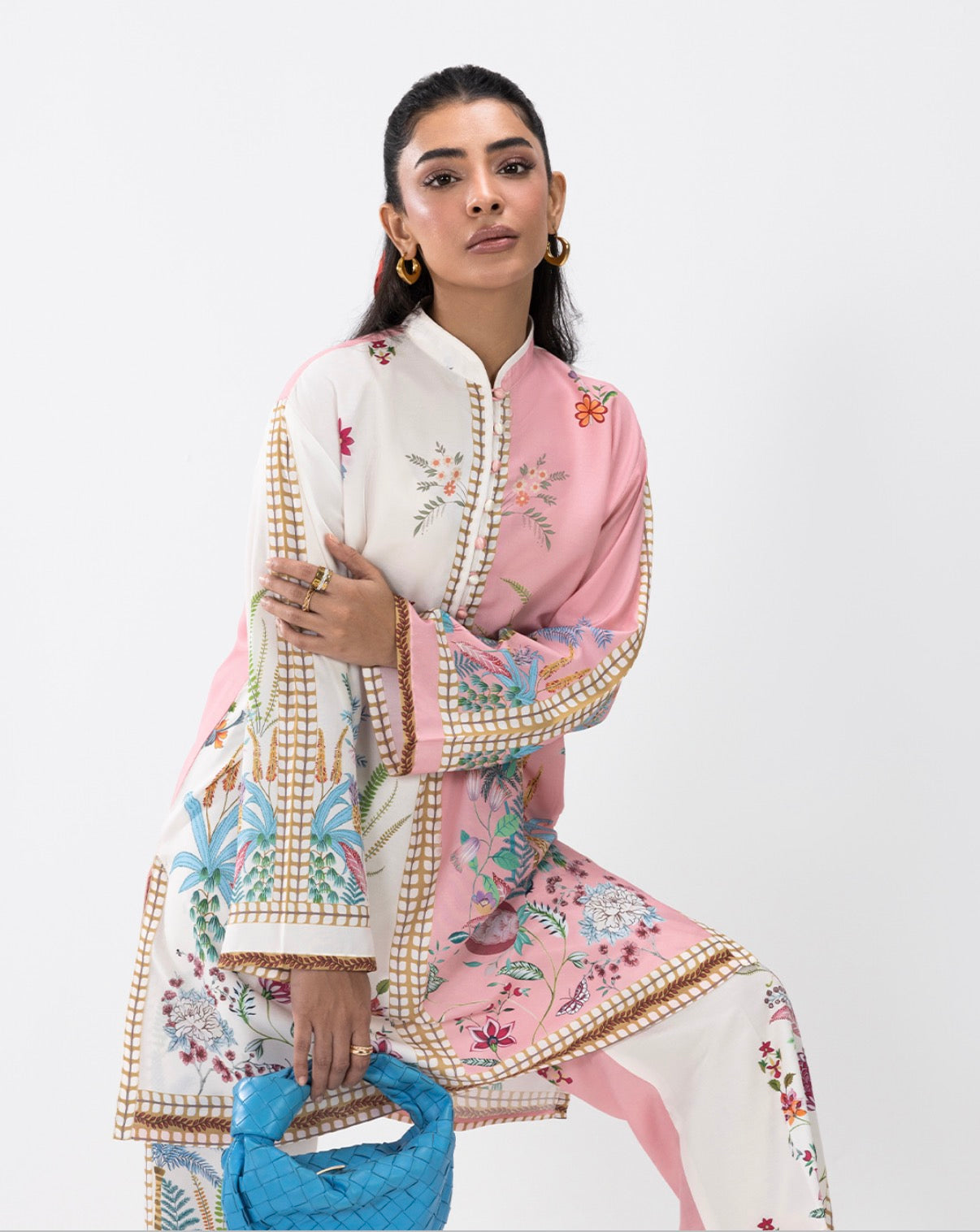Crafted in lightweight French crepe, this set drapes beautifully while keeping you comfortable all day long. The soft ivory and blush pink color-block design is elevated with delicate floral prints and contrast borders, giving it a refined yet contemporary look.
