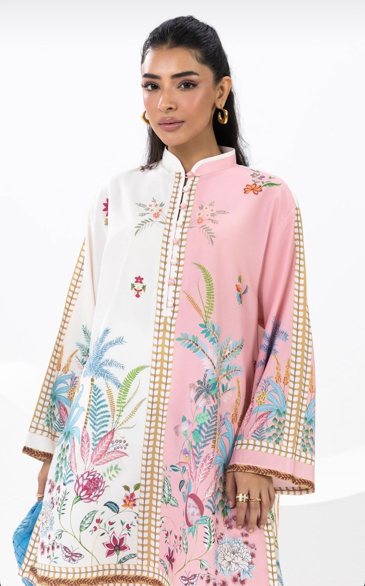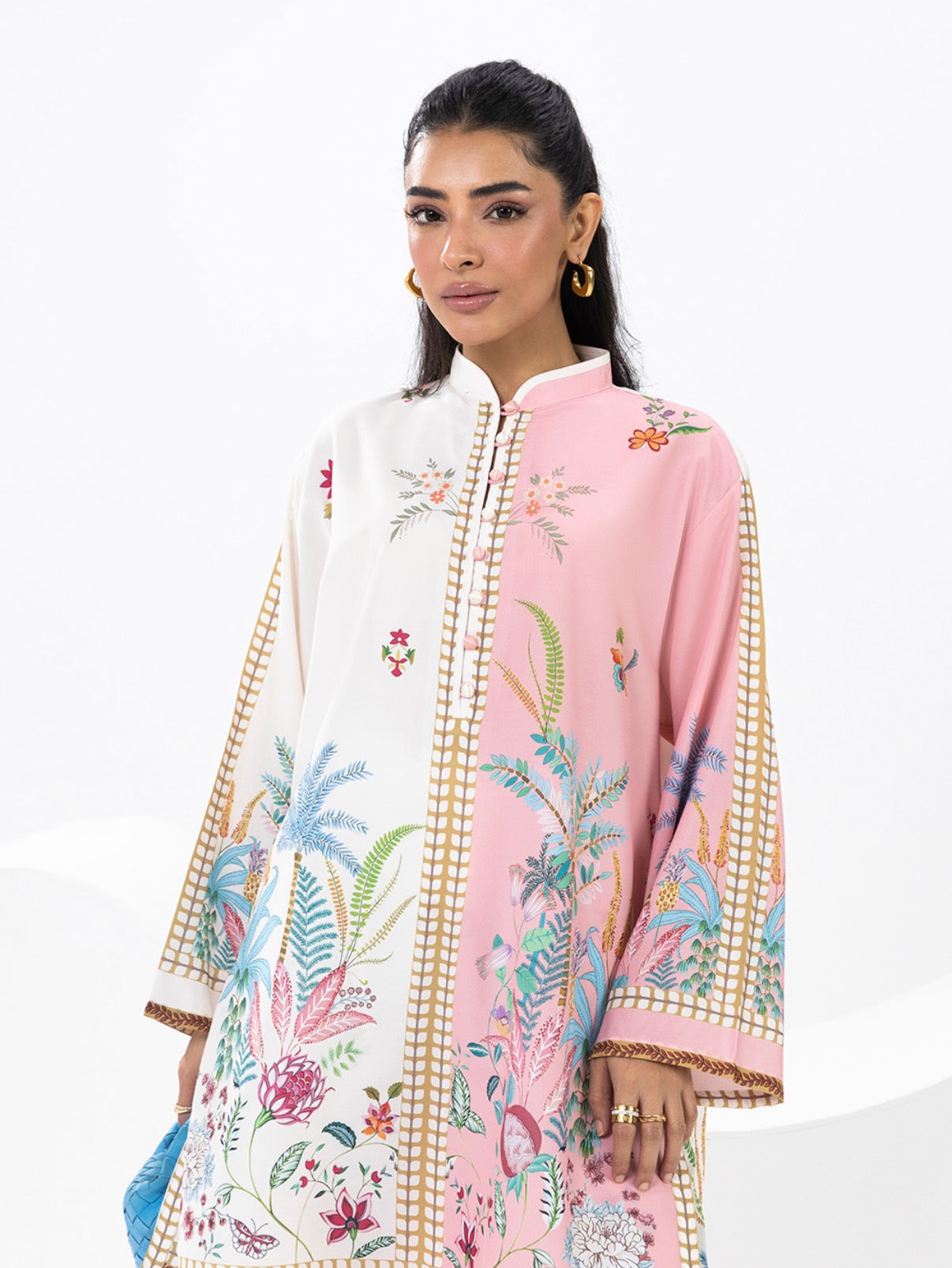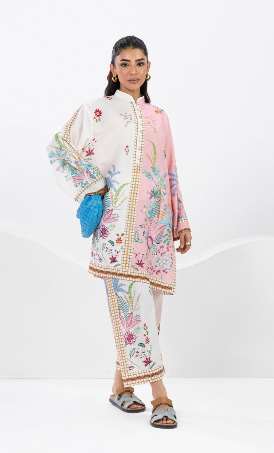 Crafted in lightweight French crepe, this set drapes beautifully while keeping you comfortable all day long. The soft ivory and blush pink color-block design is elevated with delicate floral prints and contrast borders, giving it a refined yet contemporary look.