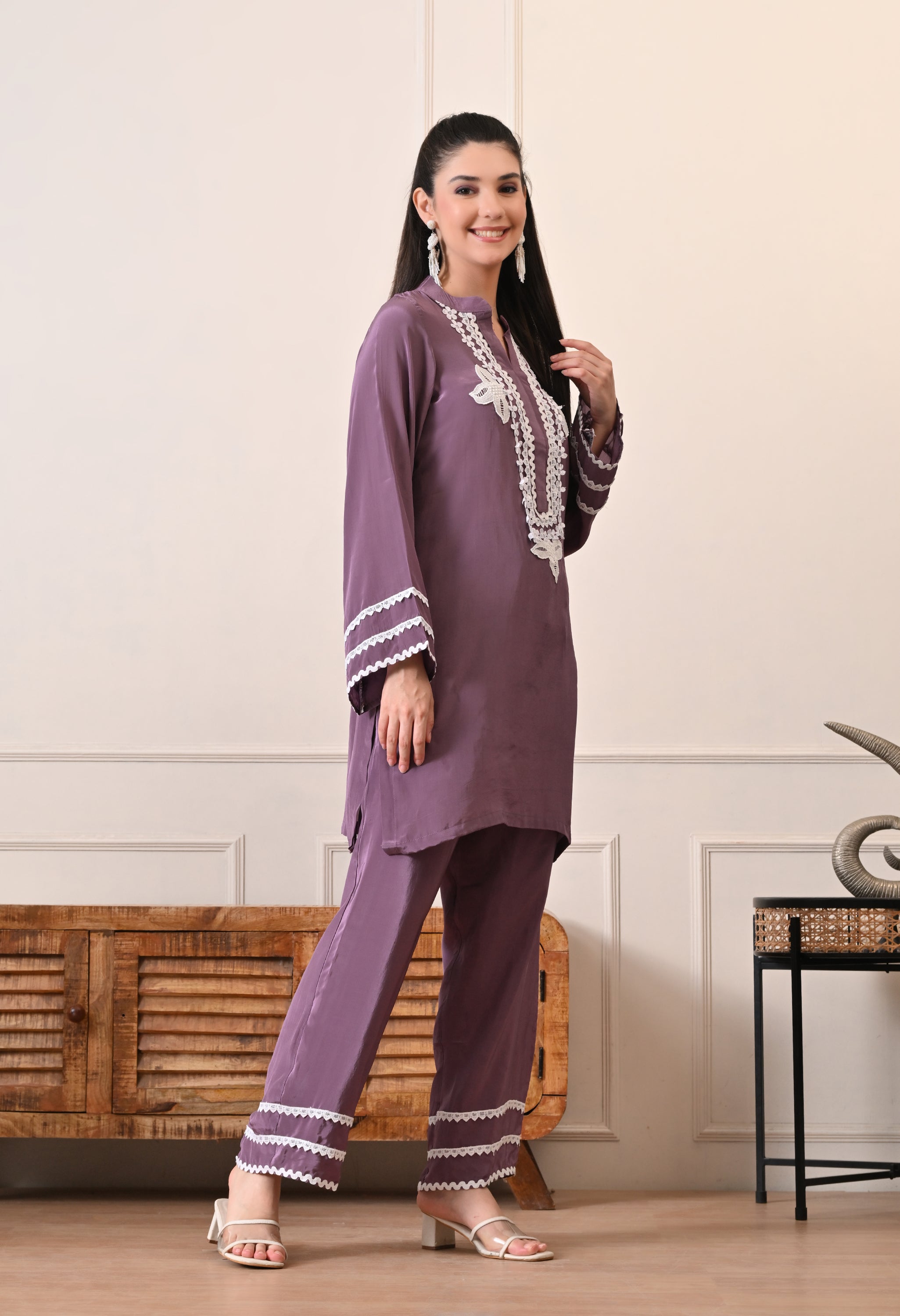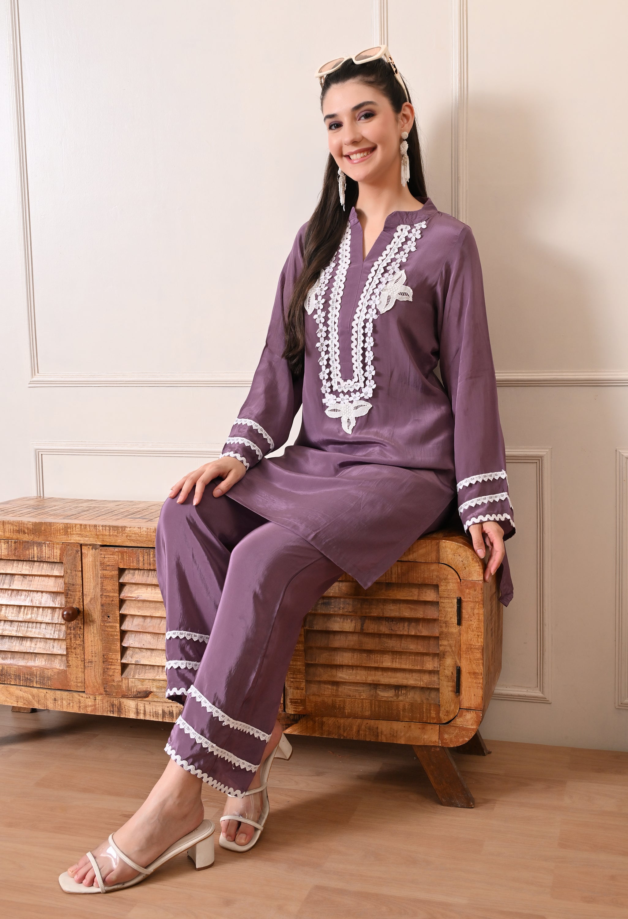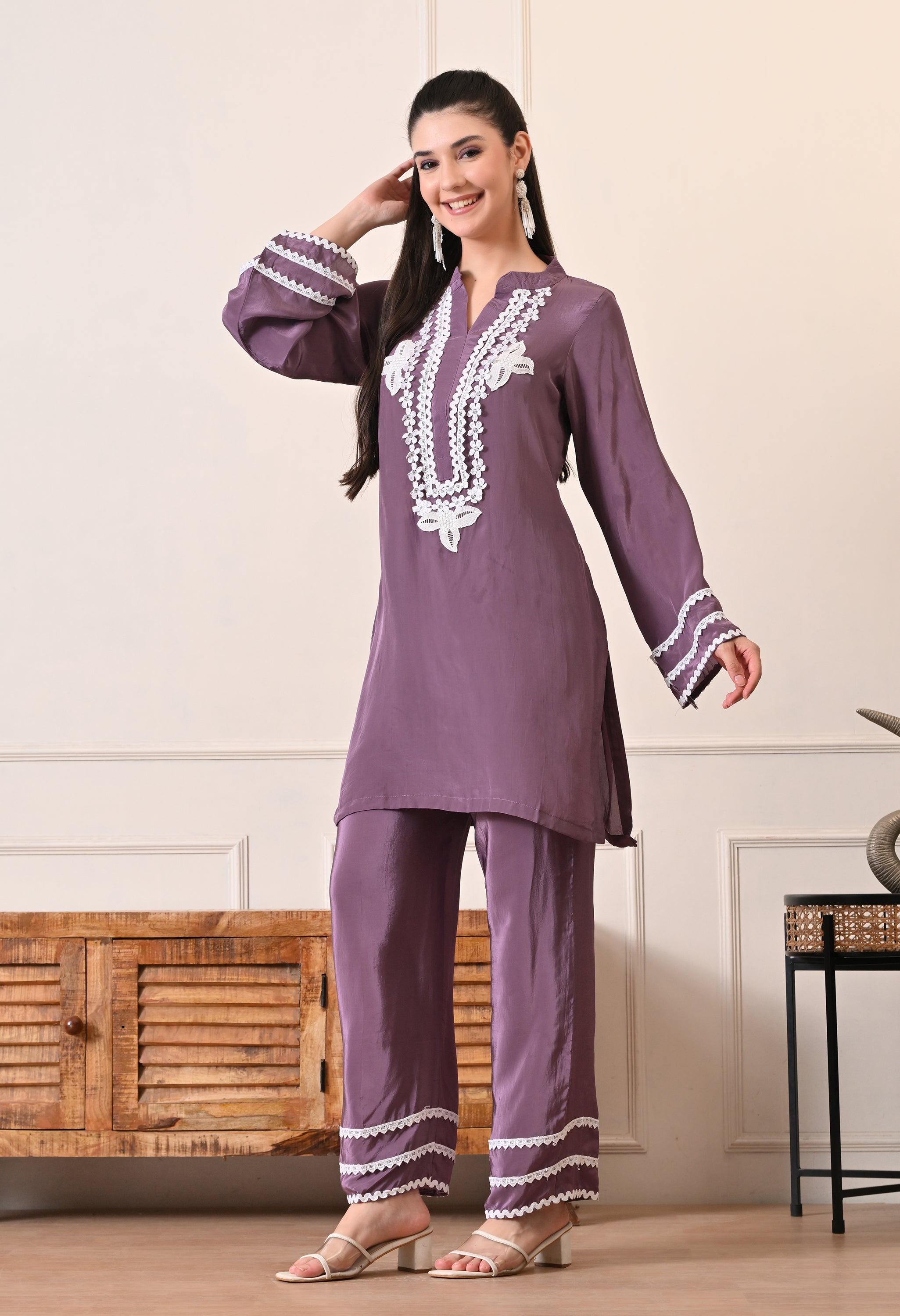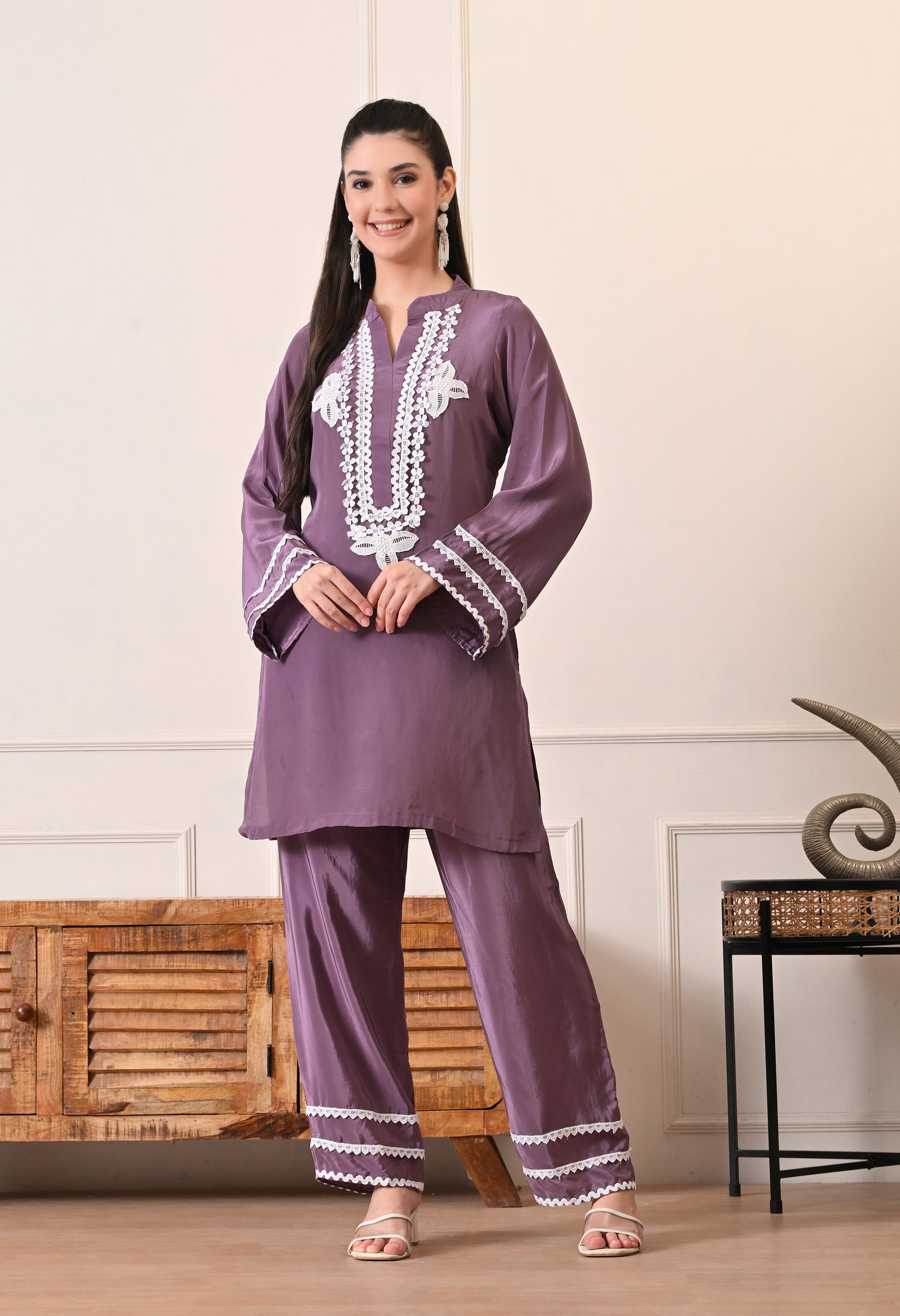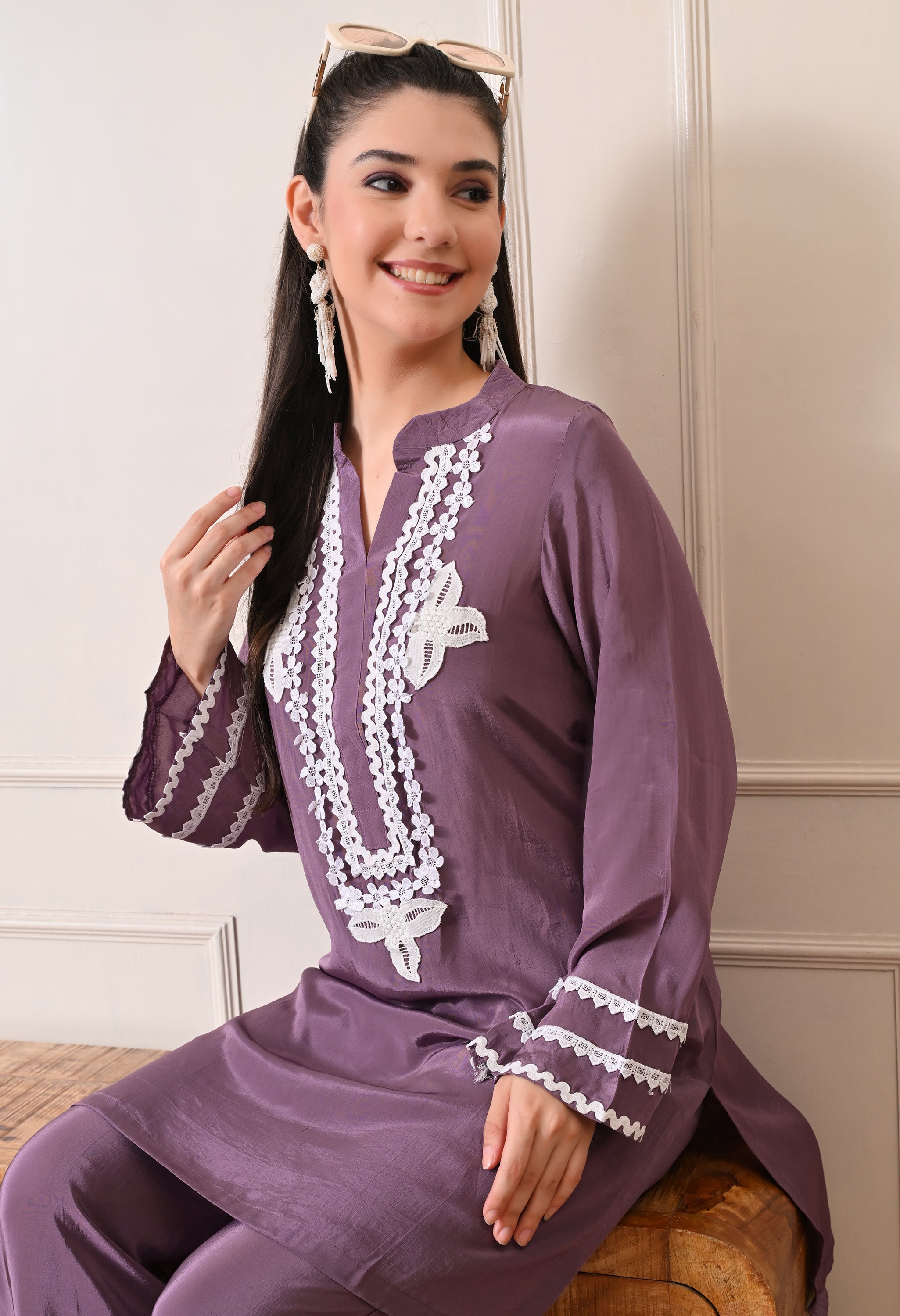 The kurta features intricate white lace embroidery along the neckline and subtle lace accents on the sleeves, adding a soft feminine touch. Paired with relaxed straight-fit pants finished with matching lace detailing, the look feels cohesive, polished, and effortlessly stylish.