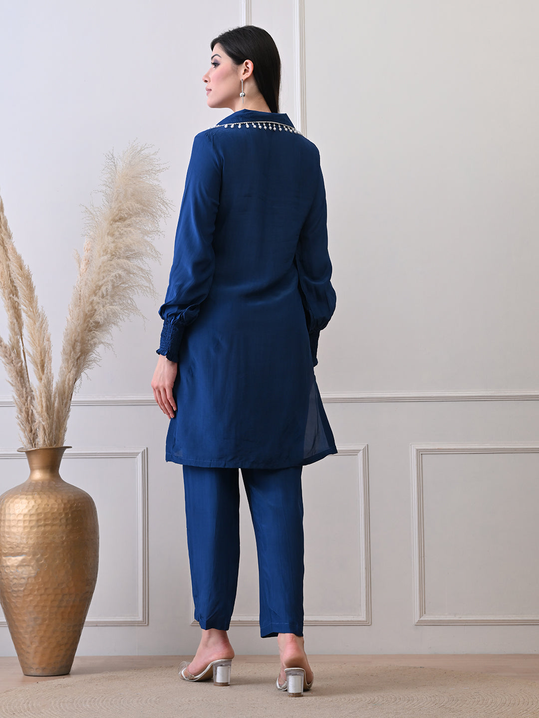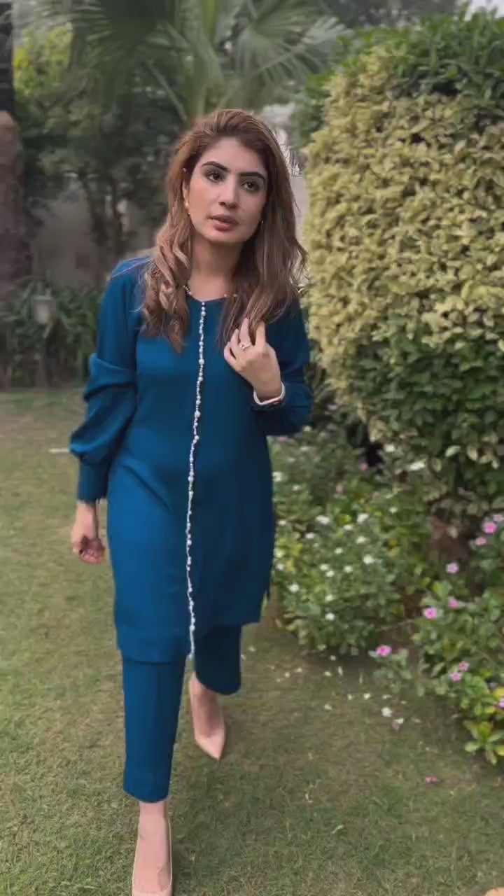The kurta features a sleek V-neckline with delicate pearl detailing along the front placket and shoulder, adding just the right hint of sophistication. Paired with straight-fit pants, the silhouette is clean, elongating, and endlessly flattering.