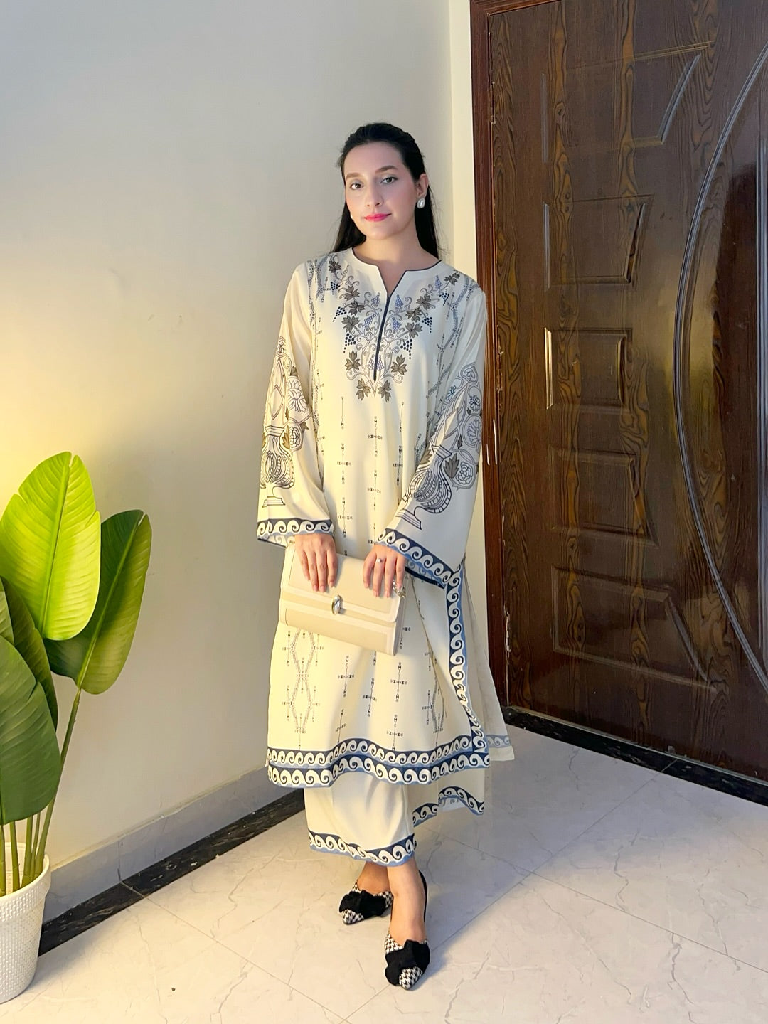 Grace meets grandeur in the Ivory Empress Coord Set. Crafted from luxurious Korean BSY fabric, this set features an elegant long kurta silhouette enhanced with intricate digital floral and geometric prints in earthy tones. The flared sleeves and scallop-inspired borders add a regal touch, while the straight-fit matching pants ensure comfort and fluidity. Ideal for semi-formal lunches, festive affairs, or artful everyday wear.