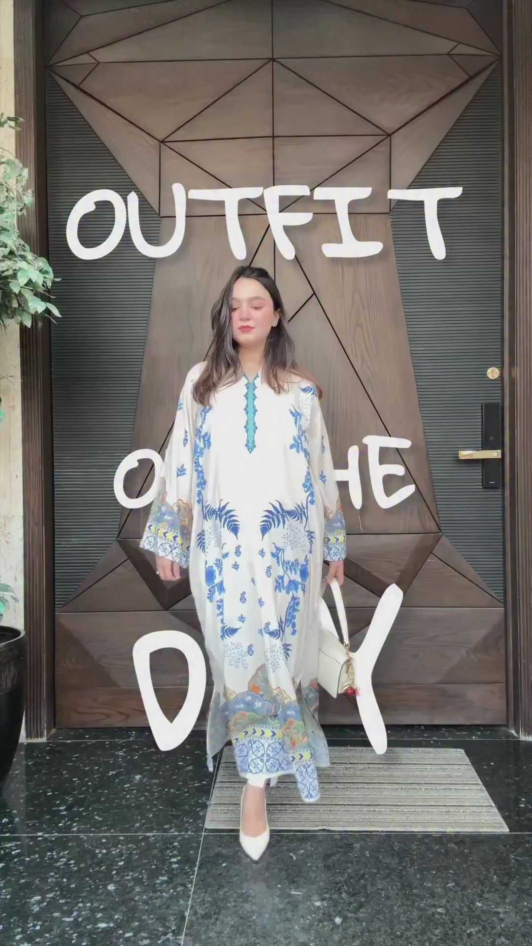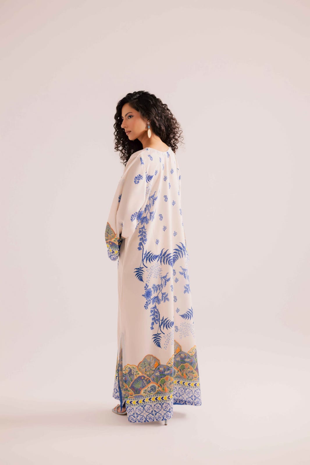 Crafted in soft silk crepe, this flowy silhouette features delicate blue botanical motifs on a serene ivory base, creating a look that feels both graceful and elevated.