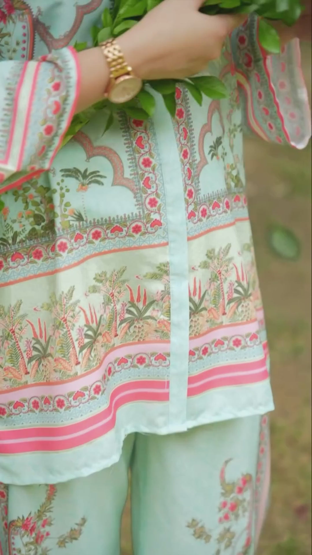 The shirt and coordinating trousers feature an enchanting digital print of botanical gardens and scrolling Mughal-inspired motifs, all set against a tranquil mint green base. The look is beautifully framed by contrasting hot pink and peach borders on the cuffs, placket, and trouser hems, giving this outfit a fresh, sophisticated flair perfect for day events, casual gatherings, or spring/summer festivities.